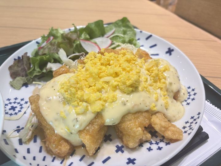 注文したのは、肉厚なチキンの上にタルタルソースがたっぷりかかった「宮崎名物 チキン南蛮プレート」。宮崎ソウルフードとして有名なチキン南蛮を心ゆくまで堪能できる、お店自慢のメニューです。ランチメニューは、スープとサラダ、選べるドリンクがセットになっています。(一部対象外のメニューあり)