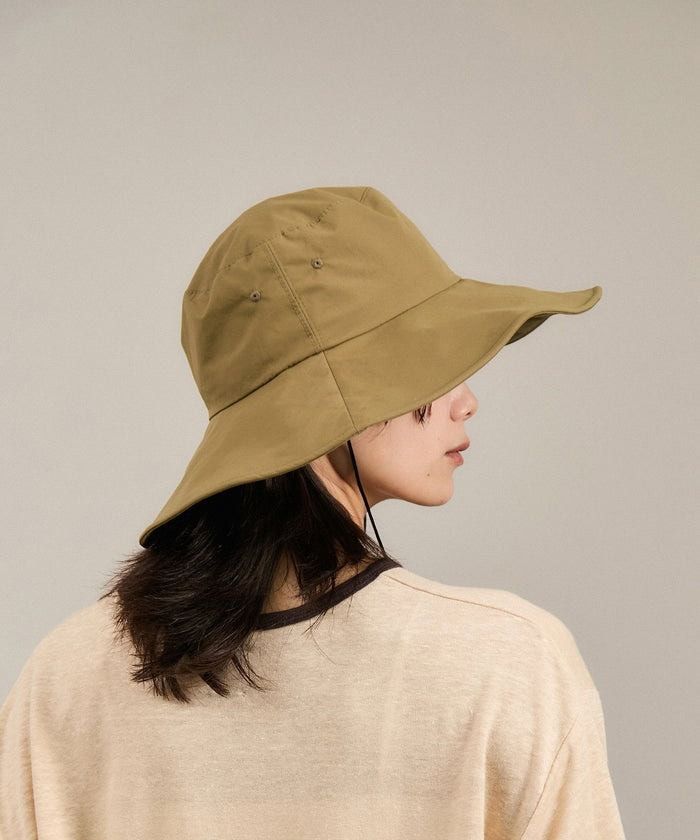 印象に残る顔まわりを演出するジュエリーやヘアアクセサリーなどを提案するブランド、イリスフォーセブンのブリムハットは、やはりエレガントなムード。ミリタリーハットから着想を得て作られたというデザインながら、上質な素材感やドラマティックに広がるツバで女性らしくかぶれる仕様に。防水、耐水、透湿性機能を持つ高密度コットン生地が使用され機能性も抜群です。
