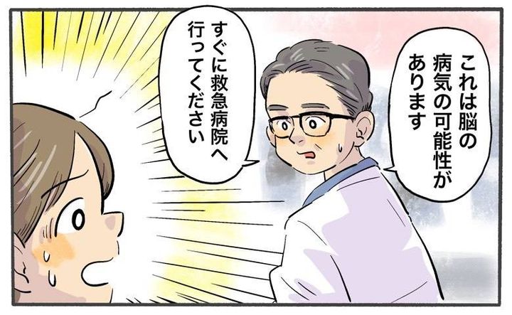 「これは脳の病気である可能性があります。紹介状を書くので、すぐに脳外科のある近所の救急病院へ行ってください。誰か家族は来られますか? タクシーで来てもらって、あなたは運転しないで」と言われました。