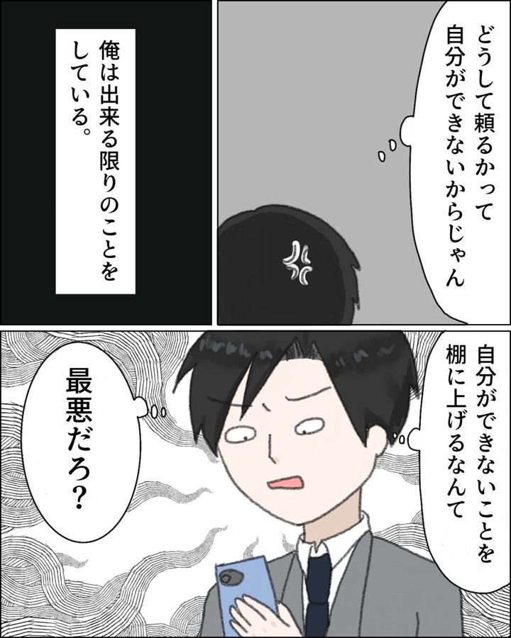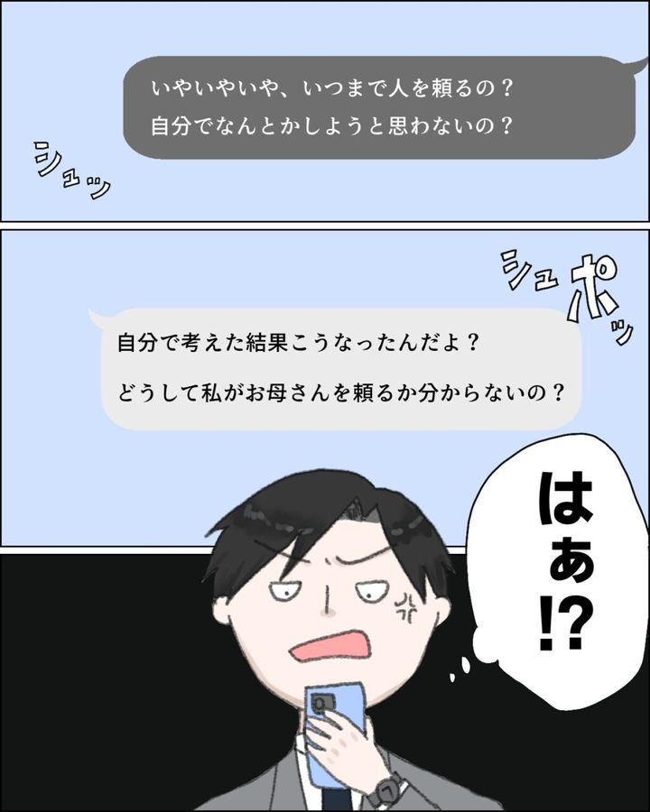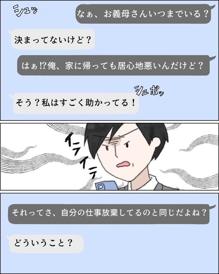 そして、「なぁ、お義母さんいつまでいる?」と私にメッセージが。「決まってないけど?」と返信をするも、「はぁ!?俺、家に帰っても居心地悪いんだけど?」カズヒデの不機嫌そうなメッセージに、「そう?私はすごく助かってる!」私の返信を見て、イライラが募るカズヒデから、「それってさ、自分の仕事放棄してるのと同じだよね?」とメッセージが送られてきて、思わず「どういうこと?」と聞き返しました。