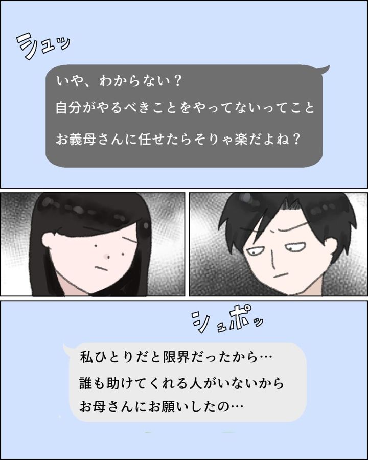 「いや、わからない?自分がやるべきことをやってないってこと。お義母さんにあかせたらそりゃ楽だよね?」カズヒデからのメッセージに、「私ひとりだと限界だったから・・誰も助けてくれる人がいないからお母さんにお願いしたの・・」と答えました。