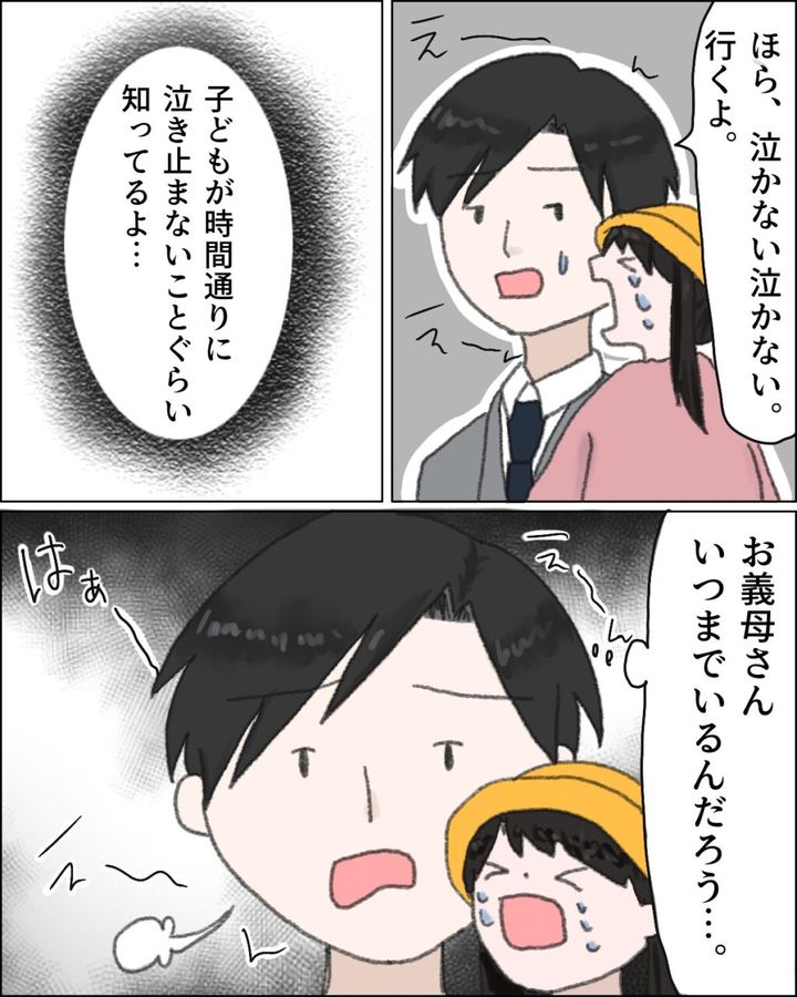 そして、「ほら、泣かない泣かない。行くよ」と声をかけるも泣き止まないリコを見て、「子どもが時間通りに泣き止まないことくらい知ってるよ・・」と心の中で呟くカズヒデは、「お義母さんいつまでいるんだろう・・」とため息をつきながら言いました。