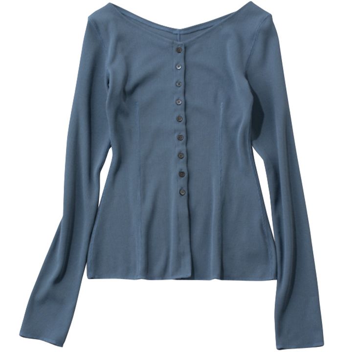デコルテラインを綺麗に見せるカッティングに女性らしさが。 ブルーVネックカーディガン¥22,990(エイチ ビューティー&ユース)