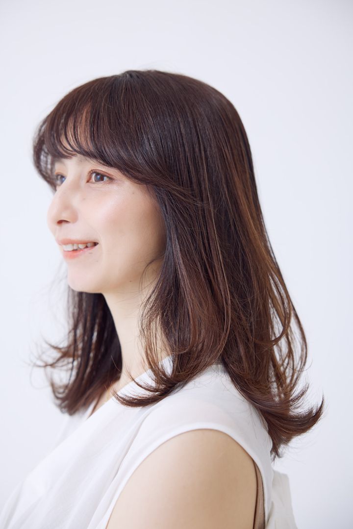 しっかりとくびれを効かせることで、メリハリのあるシルエットを演出。ペタンとしやすい大人髪でもボリュームをちゃんと感じさせ、かつトレンドの雰囲気もまとえます。顔まわりは目元に沿って流し、うれしい小顔見せも実現。