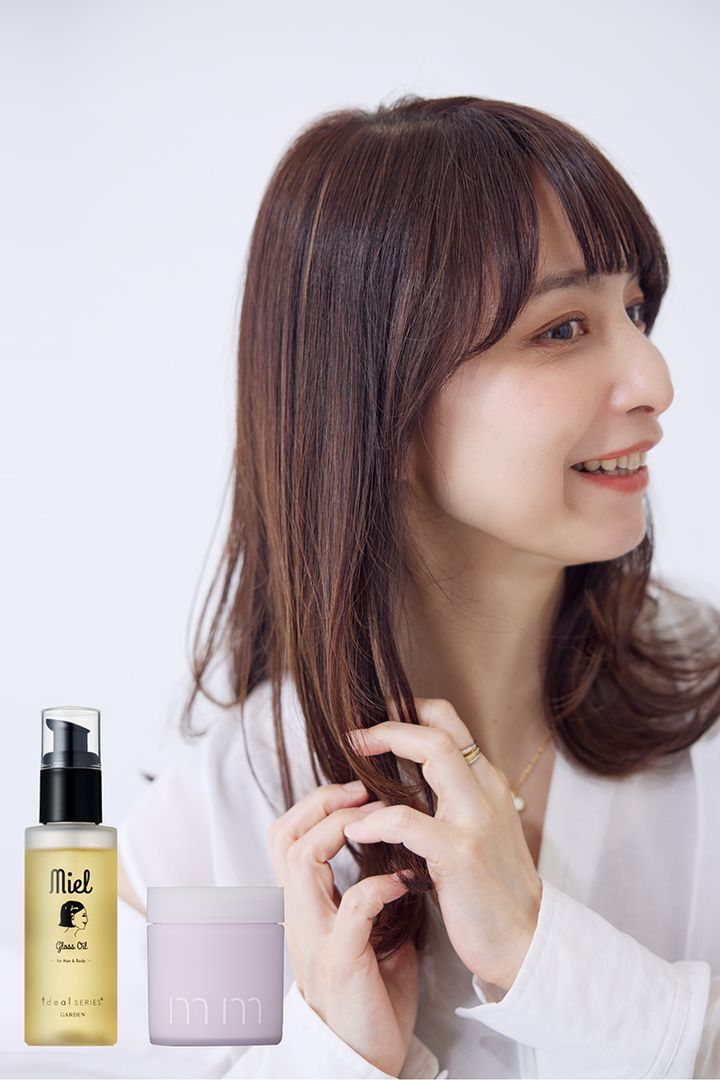 32㎜の太めのアイロンで毛先を外ハネに巻き、表面は内巻きにします。ヘアオイルとバームを手のひらでよく混ぜて、手グシを通すようにしてなじませてまとまりを。
