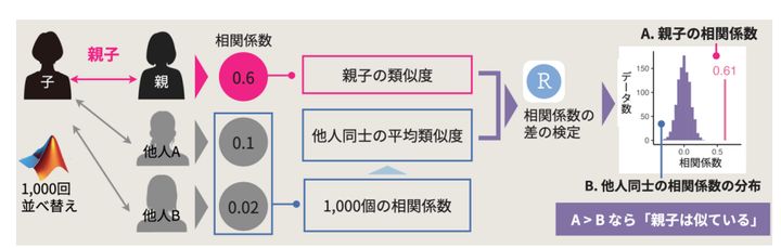比較には、「親子の類似度」と「他人同士の平均類似度」を計算し、相関係数の差を検定することで、「親子は似ている」と判断する厳密な手法が採られました。