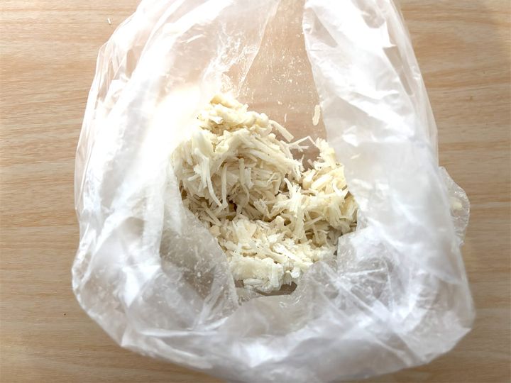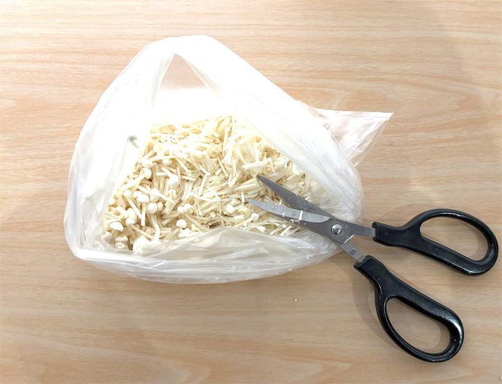 えのきたけは、石突の部分を切り落としてから、包丁やキッチンばさみなどで細かく刻み(わたしはキッチンばさみを使用)、ポリ袋に入れます。