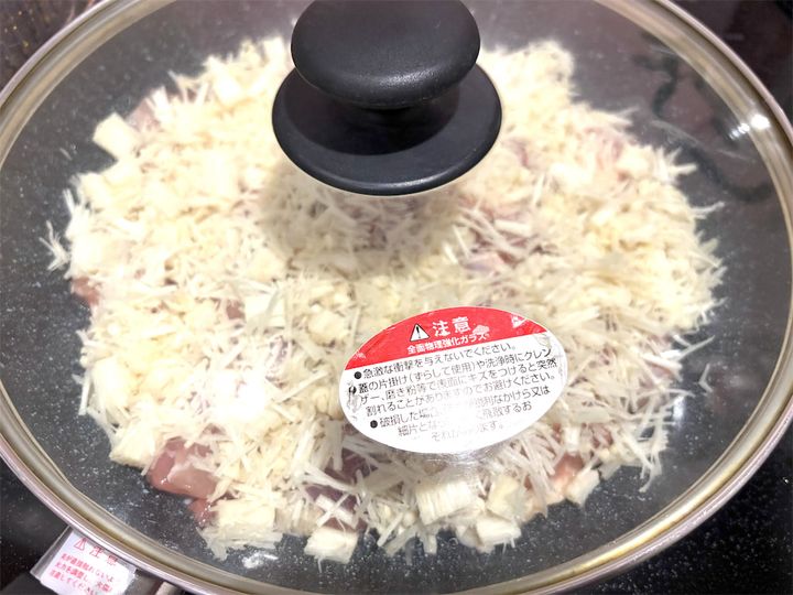 フタをしたら弱めの中火(IHクッキングヒーターだと160℃前後)で5~6分焼きます。 ⁣ ⁣