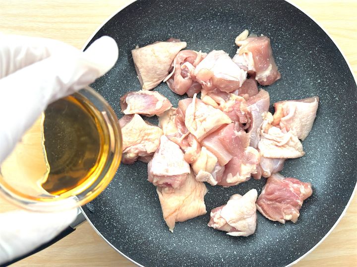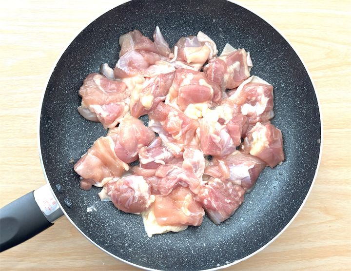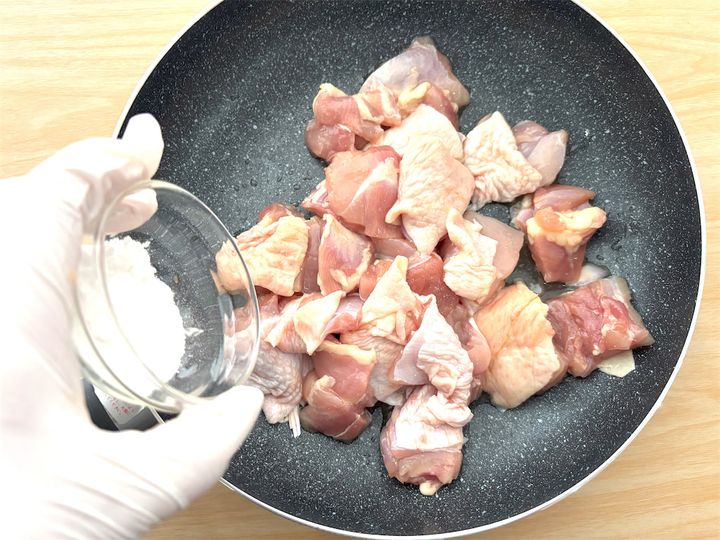 鶏肉を食べやすい大きさ(だいたい1口大)に切り分けてからフライパンに入れ、 白だしとこしょうをふりかけて、よくもみ込みます。