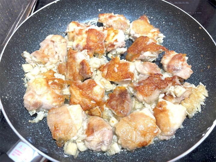 皮がパリッときつね色に焼けたら、⁣フタを開けて鶏肉を裏返し、さらに5~6分焼きます。