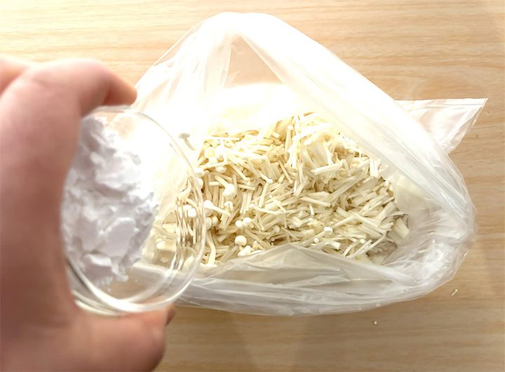袋の外からもむようにして片栗粉を全体にまぶすと、中のえのきたけは下の画像のような状態になります。