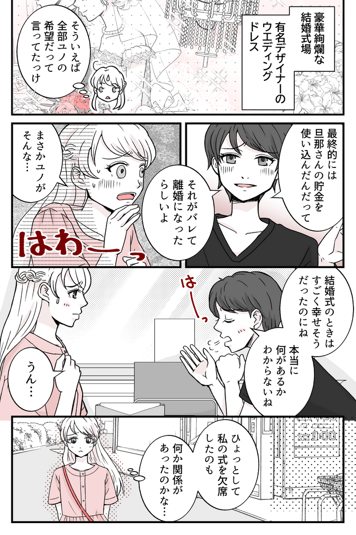 原因はユノの浪費癖だそうです。あのときの豪華な結婚式を思い出すと、なんだか合点がいきました。だけどまさか貯金まで使い込んでいたとは……。私の結婚式を欠席したのも、何か関係があったのかもしれません。