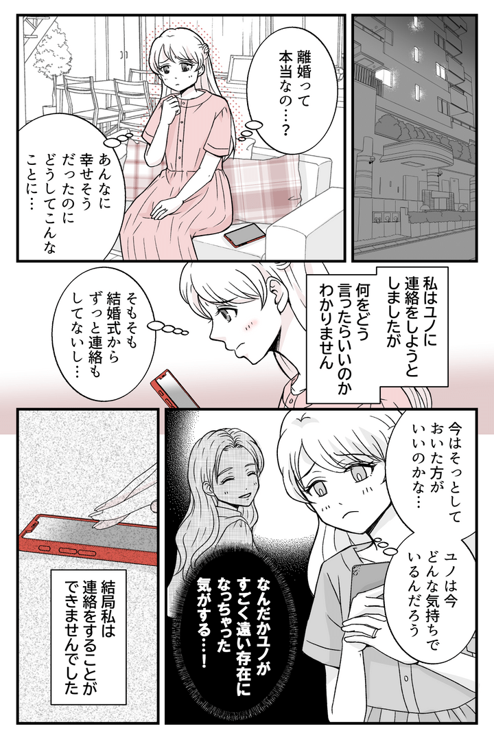 ユノが離婚したなんて、本当に寝耳に水でした。私はサアヤと別れた後、ユノのことを考えながら家に向かいます。結婚式のときのユノはとってもキレイで幸せそうだったのに……。ユノと連絡を取るべきなのか、悩みます。