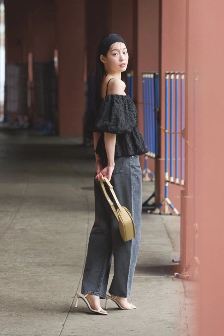 オフョルトップス 6,600円、デニムパンツ 7,700円/ともにヘザー(アダストリア)ヘアターバン 7,590円/ヘイップ(ル タロン グリーズ ルミネ新宿店)バッグ 25,100円/RAINBEE(nugu pressroom)サンダル 9,900円/チャールズ&キース(チャールズ&キース ジャパン)