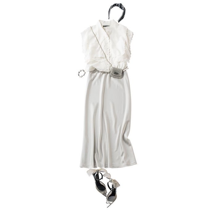 サテンスカート¥20,900(ル フィル/ル フィル ニューマン新宿店)ブラウス¥26,400(ツル バイ マリコ オイカワ)バッグ¥35,200(ANTEPRIMA/WIREBAG/アンテプリマジャパン)サンダル¥41,800(ピッピシック/ベイジュ)カチューシャ¥18,700(ジェニファー オーレット/エッセンス オブ アナイ)ブレスレット¥110,880(バルブス/ZUTTOHOLIC)