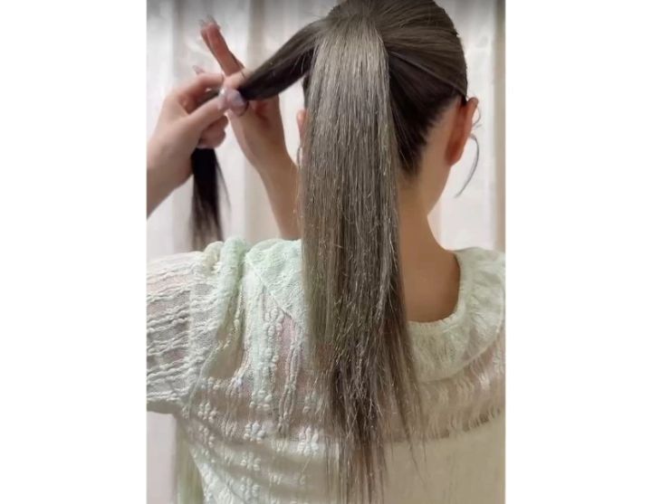 2で結んだ毛束を二つに分け、片方を適当なゴムで仮留めしておきます。毛束の中央あたりで軽く結んでよけておきましょう。