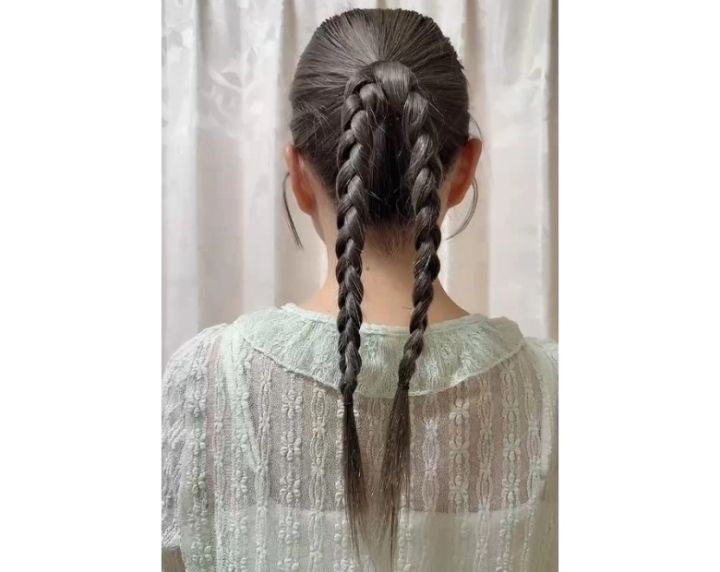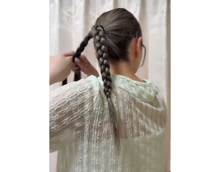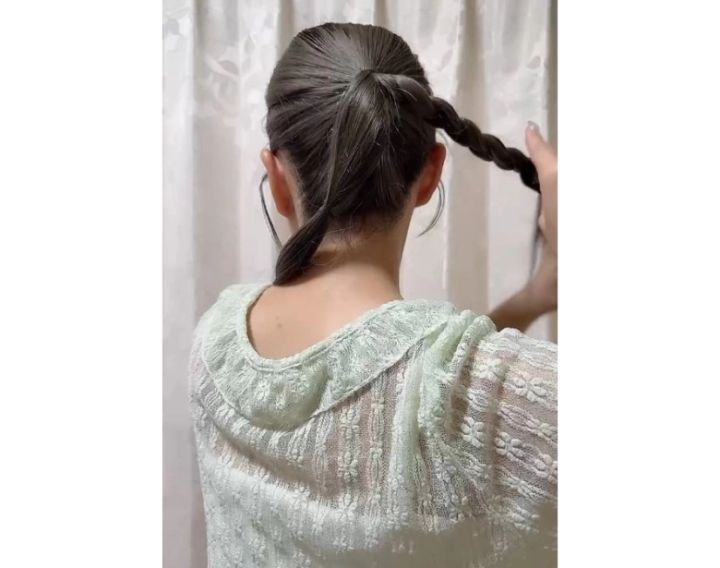 仮留めしておいた反対側の毛束も、同じように三つ編みしていきます。
