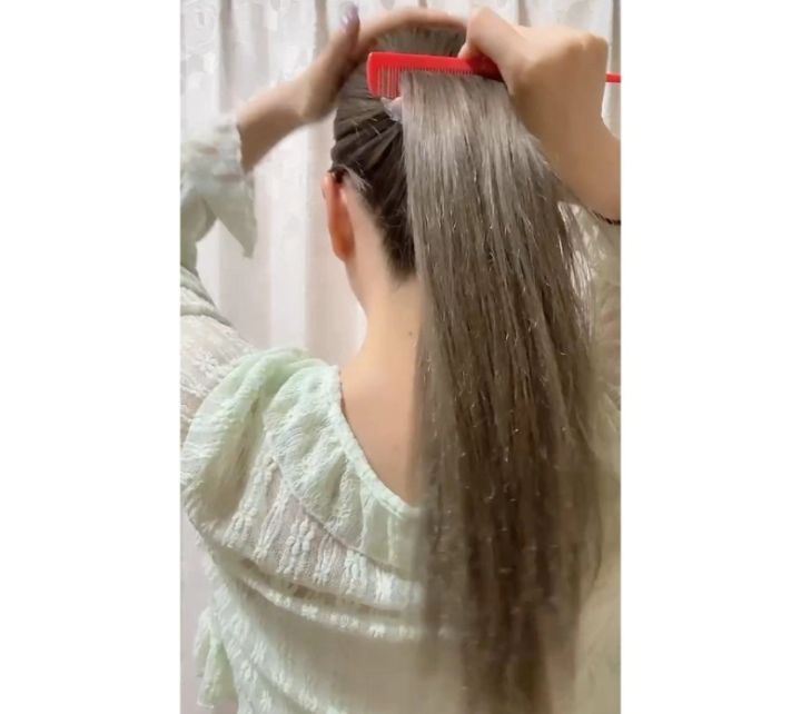 くしで梳いたら全体をキュッとひとまとめに結びます。今回は高い位置で結びましたが、低い位置で結ぶと上品な雰囲気になるので、気分や服装によって結ぶ位置を変えてみるのもおすすめです。