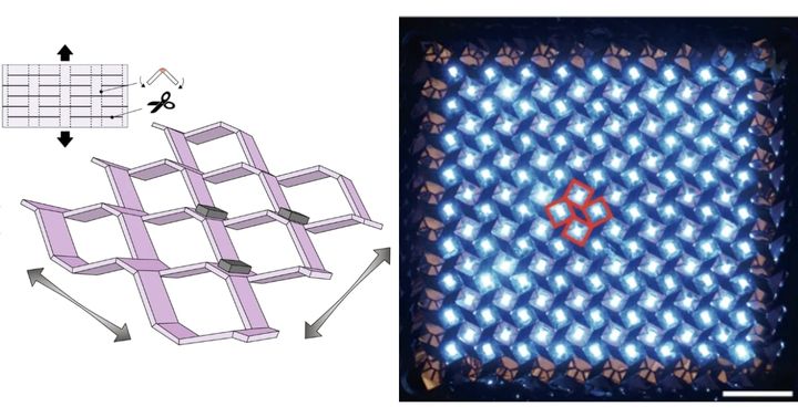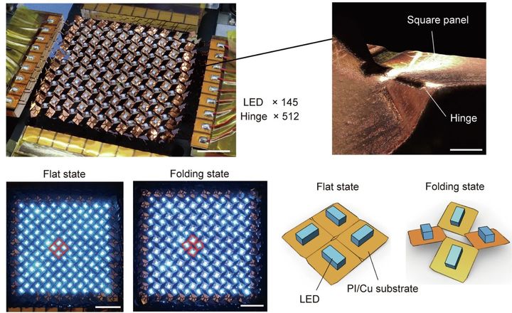 そして研究チームは、新しいキリオリガミ構造の性能を実証するため、「145個のLEDチップを取り付けたフレキシブルディスプレイ」を試作しました。
