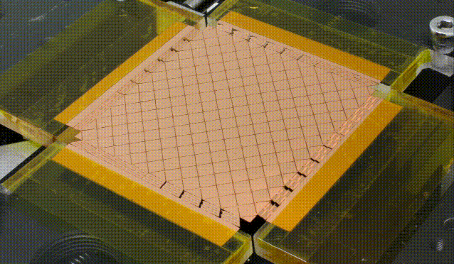 一方、切り紙構造は、構造全体を引っ張ることで簡単に変形させることができますが、電子素子を載せるのに適した平らな面が少ないという欠点を抱えていました。