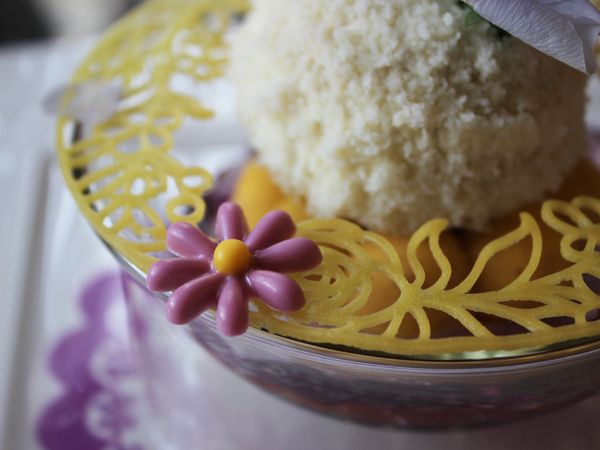 アーモンド風味のホワイトチョコームースの中には、レモンクリームが入っていて、その周りを生クリーム&ホワイトスポンジでコーティング。そのまわりを繊細な花模様のラングドシャが飾ります。