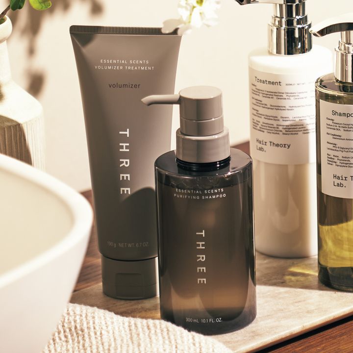 精油科学に基づくシリーズ。3種の発酵液配合でリッチな泡立ちのシャンプーと悩みに合わせた3種のトリートメントのセット。左:トリートメント 190g ¥4,400 右:シャンプー 300ml ¥4,180(ともにTHREE)