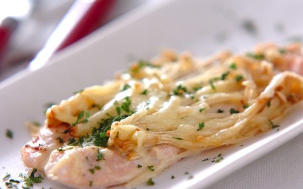材料をのせたら、あとはオーブンにお任せでOK。しっとり柔らかな鶏ささ身に、コリコリのエノキとたっぷりのチーズがからんでやみつきに! ダイエット中の方にもイチオシです。
