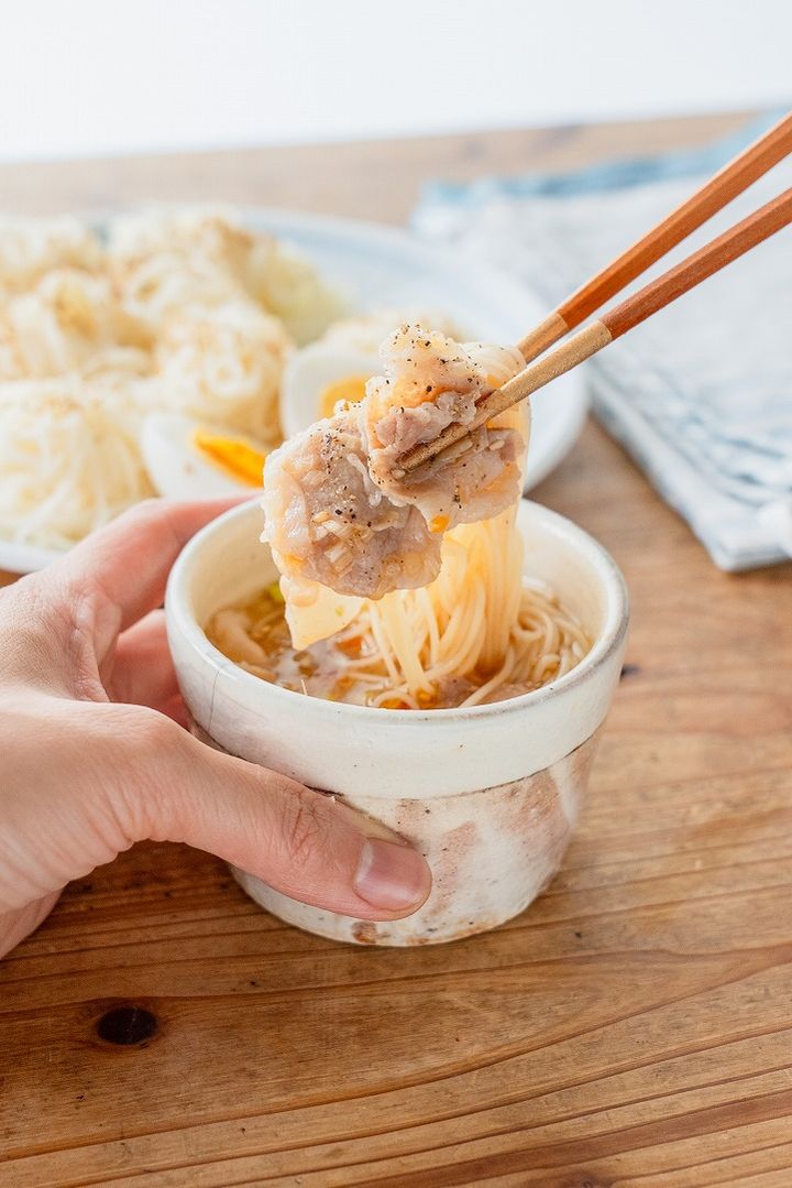 3. さっぱりだけど食べ応え◎で夏バテ対策!「豚肉ときざみネギの旨だれつけそうめん」