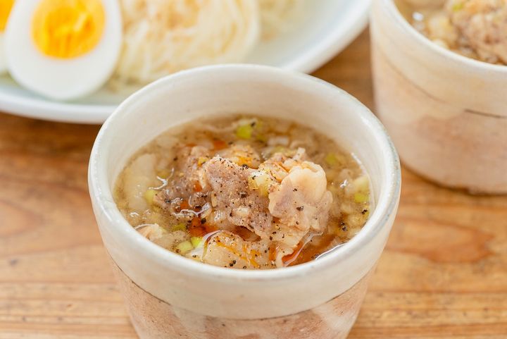 5. 器にそうめんを盛り、ゆで卵を添える。つけ汁を別の器に注ぎ、お好みでラー油を加え、粗びき黒こしょうを振る。そうめんをつけていただく。