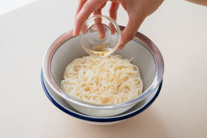 3. そうめんを表示通りにゆでる。冷水でしめて水気を切り、ごま油をかける。