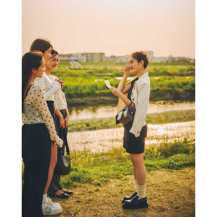 バッグ¥44,000(OSOI/ユナイテッドアローズ 渋谷スクランブルスクエア店)バッグにつけたチャームポーチ各¥18,700(ともにNOTHING WRITTEN/マルティニーク ルミネ横浜)靴¥26,250(ROUGHNECK/ハナ コリア)靴下¥1,210(靴下屋/タビオ)ピアス¥17,400(ORR/HANA SHOWROOM)リング¥35,200(アルティーダ ウード)