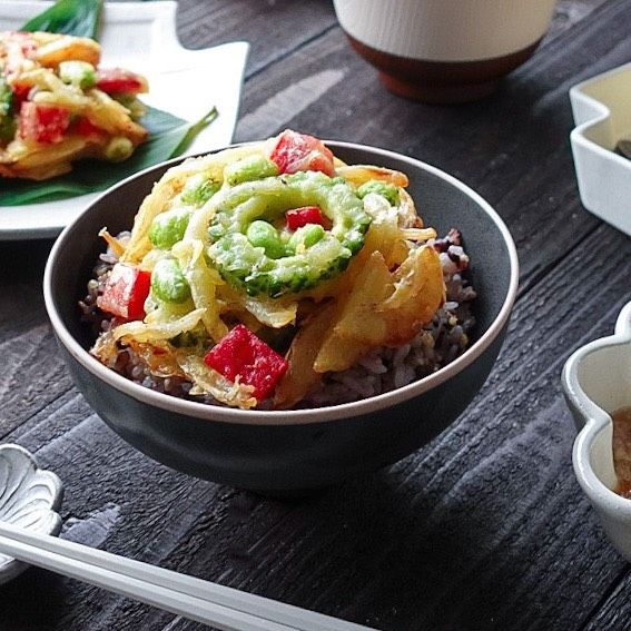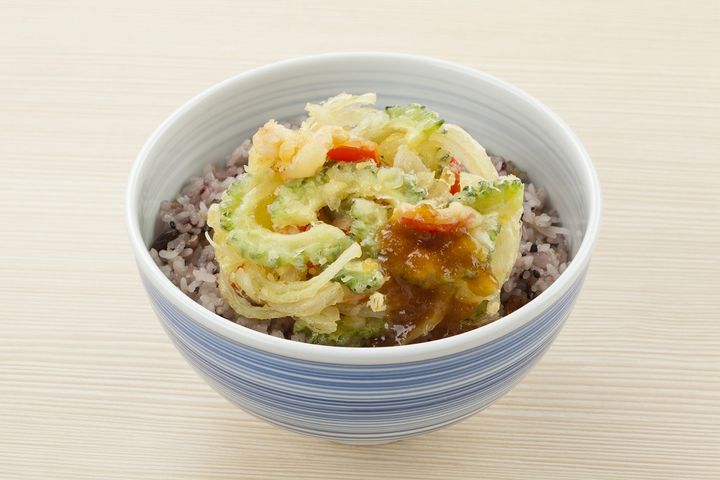 上の写真は、雑穀ごはんの上にゴーヤや赤パプリカなどのかき揚げをのせた「夏野菜かき揚げ夏越ごはん」。おろしだれでさっぱりと食べられますよ。