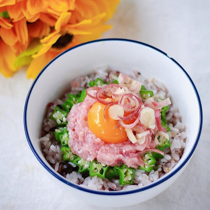 @otomisan0331さんは雑穀ごはんの上に、輪切りにしたオクラとマグロのたたきを丸くのせ、卵黄とみょうがをトッピング。まろやかなマグロのたたきと、とろ~り濃厚な卵黄が絡んで、ごはんがどんどん進んでしまいそう。