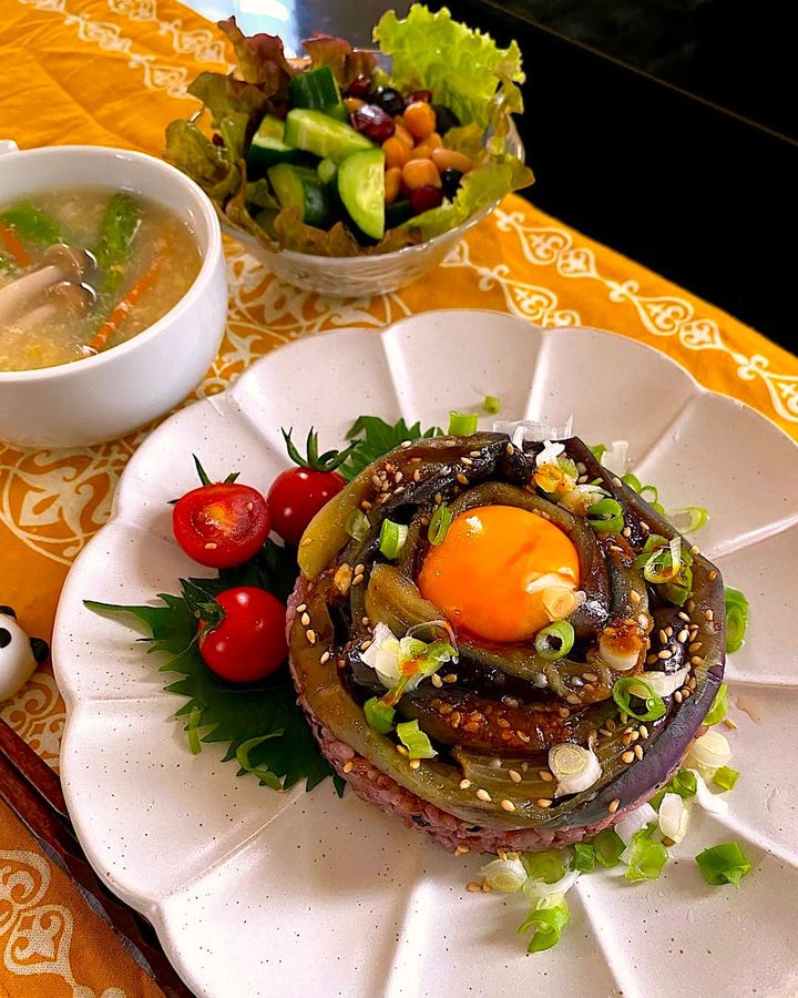 なすは、料理研究家・リュウジさん考案の「なすユッケ」にし、セルクルを使って丸い形に整えて、雑穀ごはんの上にのせています。