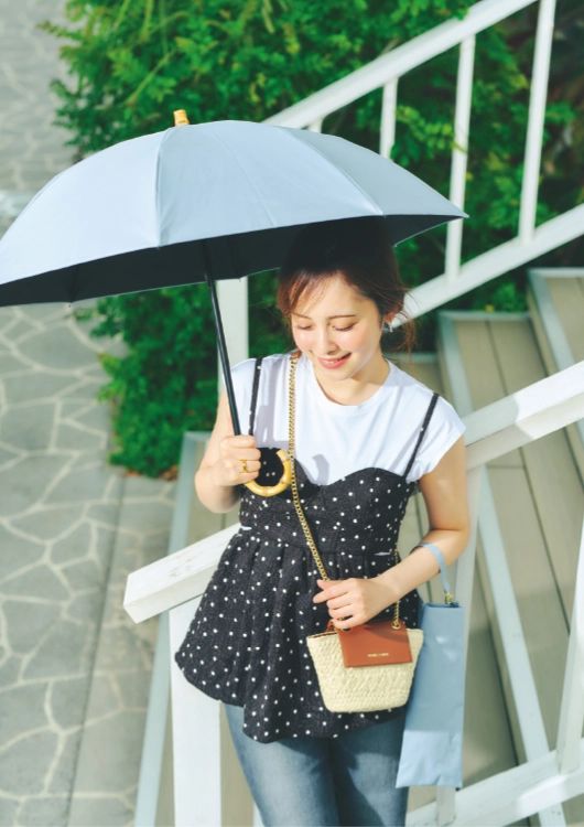 傘¥14,300/untule(キャロットカンパニー) コルセットキャミソール¥46,200/ダブルスタンダードクロージング(フィルム) カットソー[ビスチェ付き]¥13,970/LILY BROWN(LILY BROWN ルミネエスト 新宿店) パンツ¥29,700/ヤヌーク(カイタックインターナショナル) イヤリング¥13,200/ete リング¥13,200/ココシュニック オンキッチュ(ココシュニック)  バッグ¥14,900/CHARLES & KEITH JAPAN