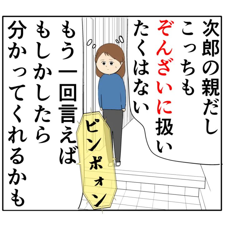 玄関ドアの手前まで行き「次郎の親だし、こっちもぞんざいに扱いたくはない。もう一回言えばもしかしたら分かってくれるかも」と思ったものの、