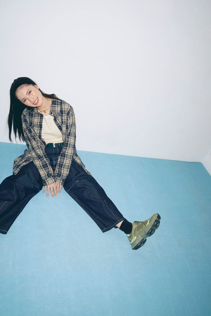 スニーカー¥24,200/ニューバランス(ニューバランスジャパンお客様相談室)、シャツ[同素材ビスチェとセット]¥4,990/フォーエバートゥエンティーワン( アダストリア)、Tシャツ¥13,200/A BATHING APE®(BAPESTORE® 原宿)、デニムパンツ¥14,993/サムシング×フリークス ストア(フリークス ストア渋谷)、ベルト¥550/SPINNS、ヘアバンド¥1,870、ネックレス¥2,200/ともにゴールディ、靴下/スタイリスト私物