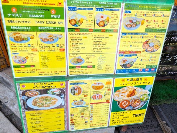 目立つ黄色いメニュー看板をじっくりと熟読。ランチの写真のナンが大きいですね~。