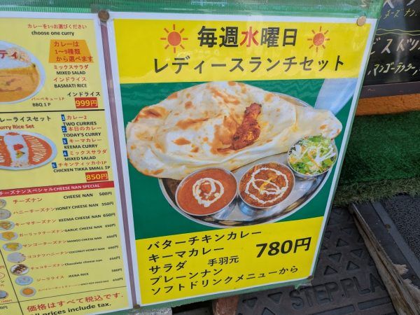 レディースランチセット 780円 毎週水曜日はレディースランチセットが食べられます。レディースランチセットは、カレーが2種類で、バターチキンカレー・キーマカレーです。サラダ・手羽先・プレーンナンと選べるソフトドリンクが付きます。