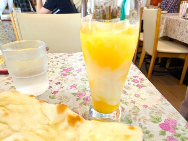 ソフトドリンクは、プレーンラッシー・マンゴーラッシー・アイスレモンチャイ・アイスチャイ・アイスコーヒー・ウーロン茶・ホットチャイ・ホットレモンチャイ・ホットコーヒーから選べるます。るなるなはマンゴーラッシーを選びました。ラッシーとナンって合うんですよね~。おいしいです。