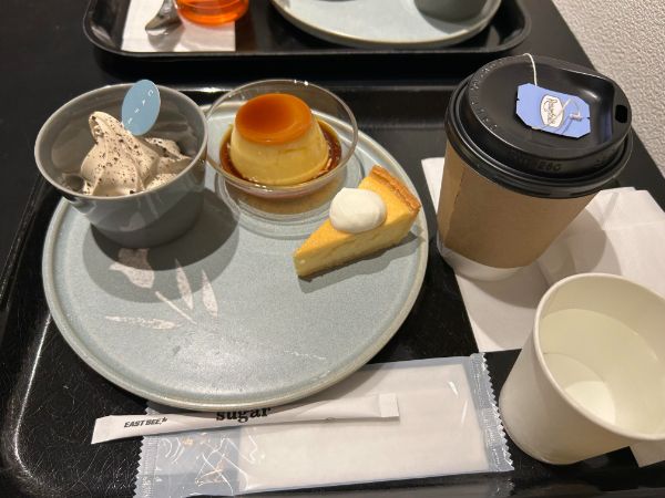 モロゾフの代表商品デンマーククリームチーズケーキとカスタードプリン、そしてニュージャーマンカフェ特製のコーヒーソフトクリームが一皿に集まりました。