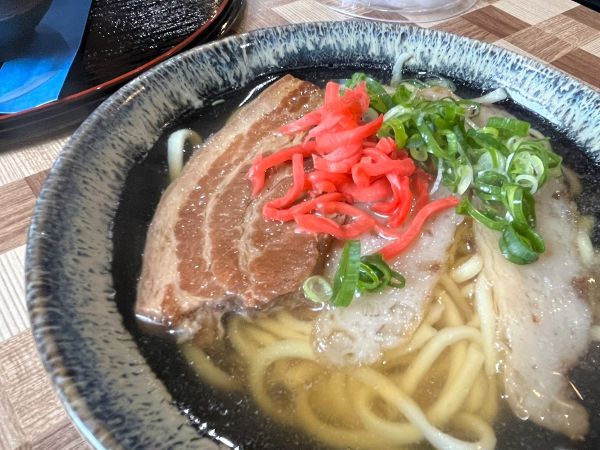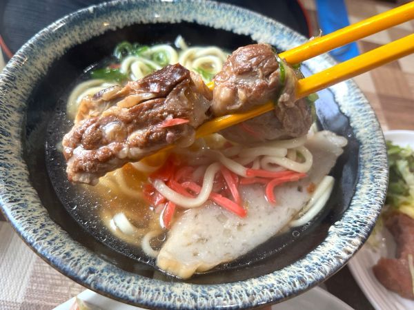 軟骨ソーキ(軟骨スペアリブ)は、大きくて持ち上げると崩れそうな柔らかさ!今まで食べた沖縄そばより、意外にも優しい味わいでした。沖縄ならではの調味料「コーレーグース」も席に置いてありましたよ!