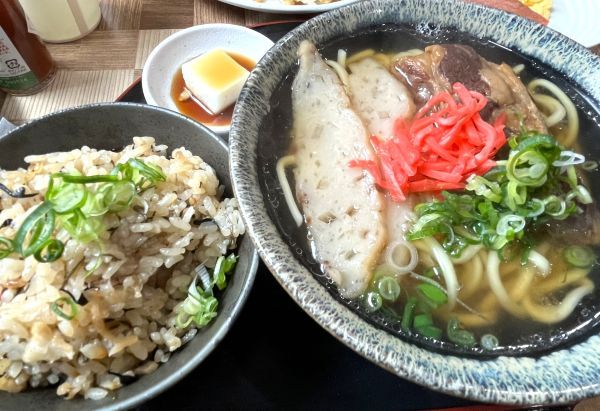 単品のおそばに、ジューシー(沖縄の炊き込みご飯)とミニジーマミ豆腐(落花生が使われた郷土料理)をセットで♪