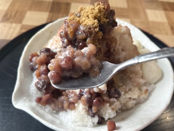 麦のもちっとした粒感が加わり、“あんこ”とは違うくせになる食感です。かき氷の上には黒糖、全体には練乳もかかっています。ツルんとした白玉5個もポイント。お皿もキンキンに冷えたこちらの一皿は、まさにここでしか食べられないかき氷でした!