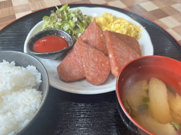 沖縄食堂の定番メニューなんだそう。揚げたポークは、厚みがあり塩っ気がしっかりしているので、ご飯がすすむ!多めのケチャップで、味変。またご飯がすすみます。ちなみに下の息子は、お麩入りのお吸い物がオススメ!!と言っています。