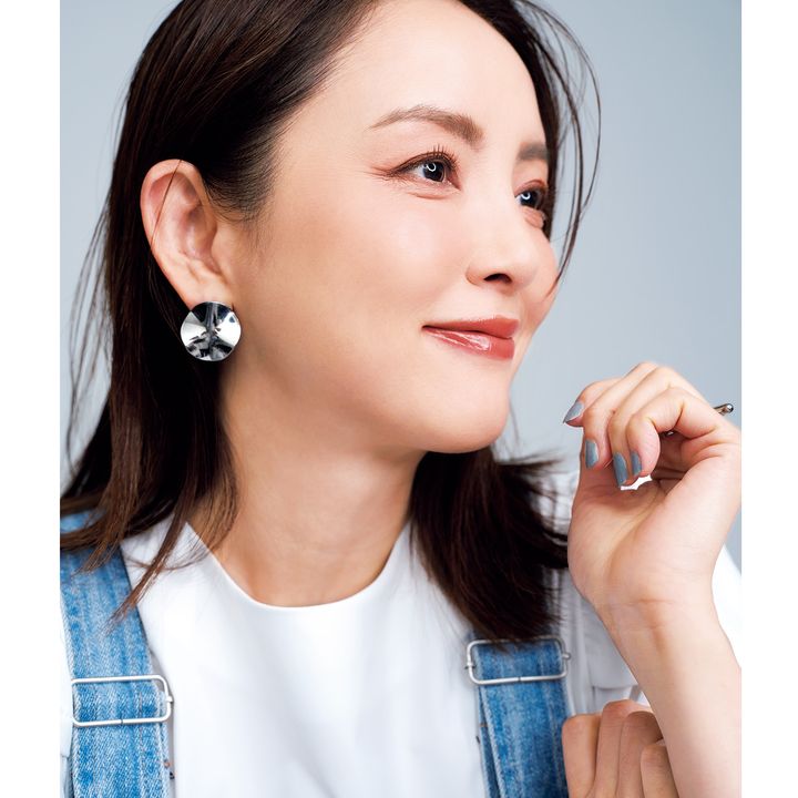 ブラウス¥14,300(シークレット・トロフィー)デニムジャンパースカート¥24,200(ヘルシーデニム/ゲストリスト)ピアス¥4,290〈ieLS〉リング¥3,300〈ヘンカ〉(ともにロードス)