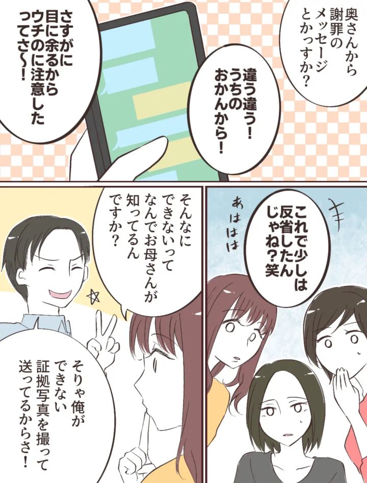 そして、「奥さんから謝罪のメッセージとかっすか?」そう聞かれ、「違う違う!うちのおかんから!さすがに目に余るからウチのに注意したってさ~!これで少しは反省したんじゃね?笑」キョウスケが笑いながらそう言うと、「そんなにできないって、なんでお母さんが知ってるんですか?」と質問が。「そりゃ俺ができない証拠写真を撮って送ってるからさ!」自信満々にピースサインをしながら答えるキョウスケ。