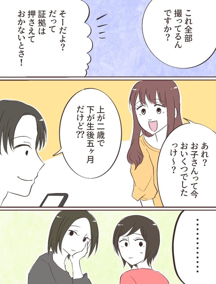 「これ全部撮ってるんですか?」と女性社員からまた質問が。「そーだよ?だって証拠は押さえておかないとさ!」そう答えるキョウスケに、「あれ?お子さんって今おいくつでしたっけ~?」と聞かれると、「上が二歳で下が生後五か月だけど??」と普通に答えるキョウスケに、「・・・」女性社員たちは言葉を失いました。
