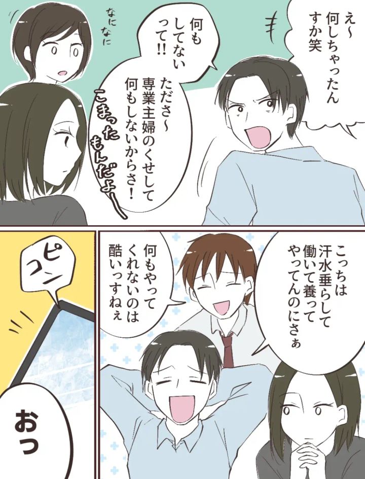 「え~何しちゃったんすか笑」笑いながらそう言われ、「何もしてないって!!たださ~、専業主婦のくせして何もしないからさ!困ったもんだよ~」キョウスケが答えると、周りの社員も「なになに」と集まってきました。「こっちは汗水垂らして働いて養ってやってんのにさぁ」そう言うと、「何もやってくれないのは酷いっすねぇ」と後輩が。するとキョウスケさんのスマホが鳴りました。