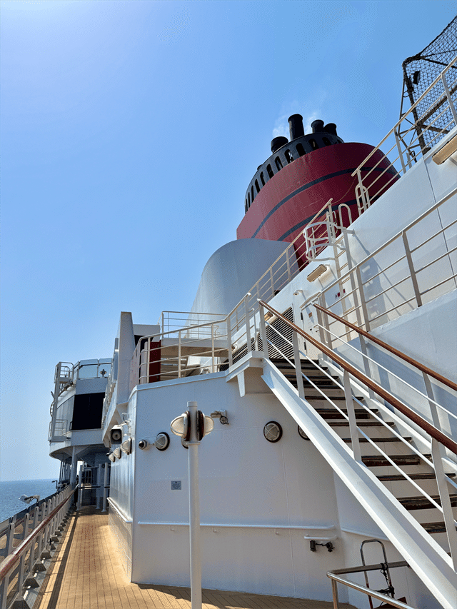 船の煙突は、シンボル的存在。キュナードの船では、赤地に黒のトップがついた煙突で、「キュナード・レッド」とも呼ばれる特徴的な色でデザインされています。